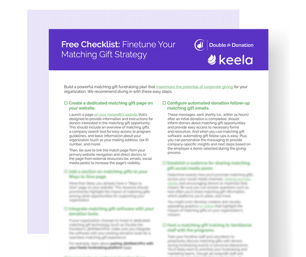 Don’t overlook the importance of investing in the right tools and resources to power your efforts accordingly, either! The right technology can streamline operations and maximize your effectiveness in engaging with corporate partners in a myriad of ways. And for that, consider Keela’s seamless integration with the leading corporate matching gift software provider, Double the Donation.