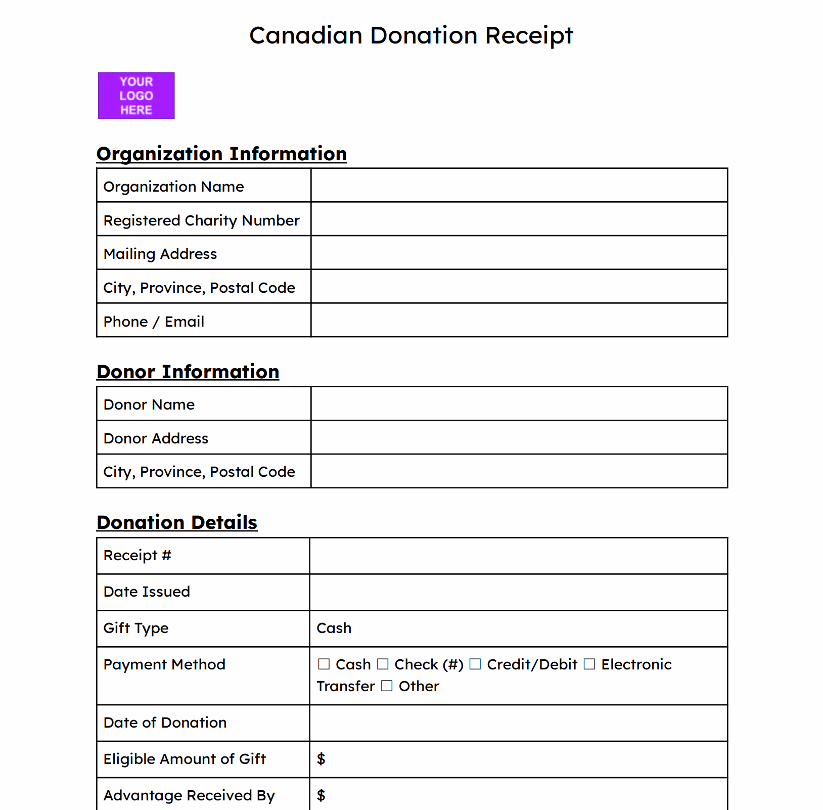 For Canadian registered charities. Formatted to meet Canada Revenue Agency (CRA) requirements for official donation receipts.