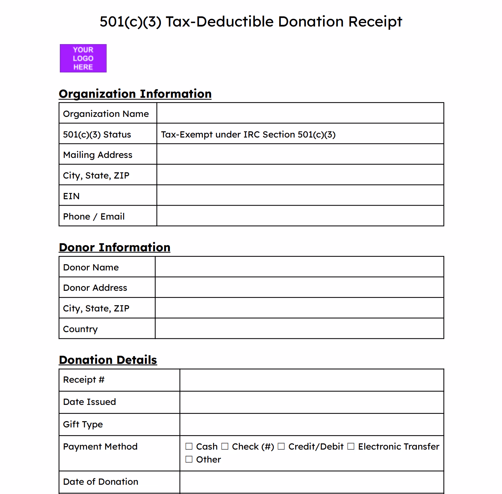 For any tax-deductible donation to a registered 501(c)(3) organization. Includes the required IRS acknowledgment statement.