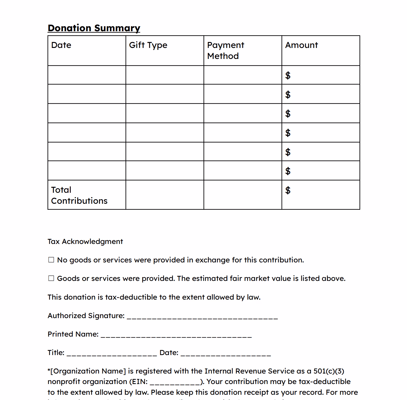 For one-time monetary donations. Includes IRS-required fields for tax-deductible cash contributions + required IRS statement.
