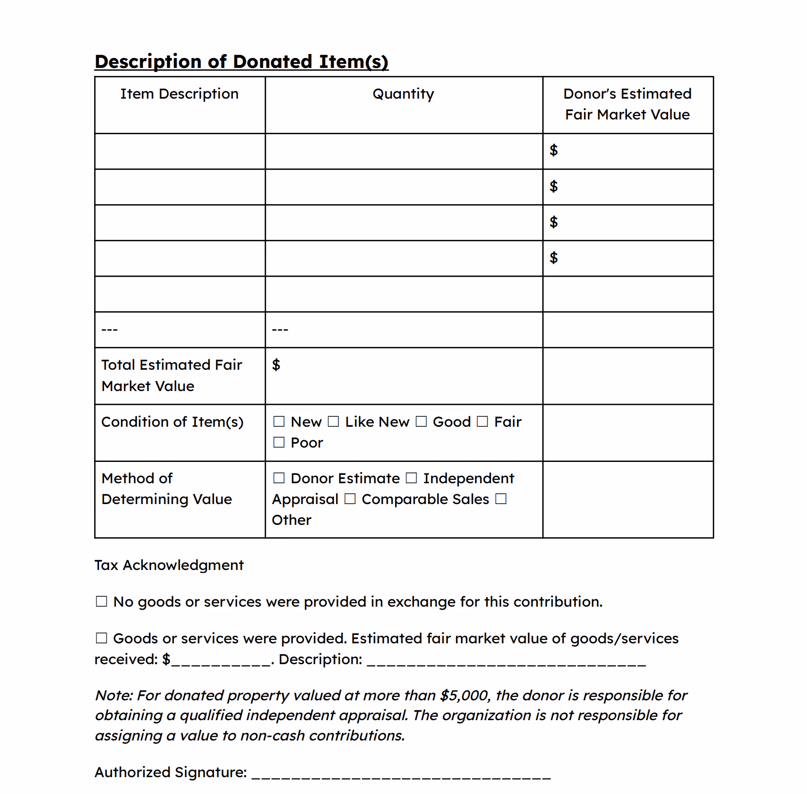 Non-cash donations valued at more than $5,000 generally require a qualified independent appraisal. The donor is responsible for obtaining the appraisal, but your organization should be aware of this requirement when accepting high-value gifts.