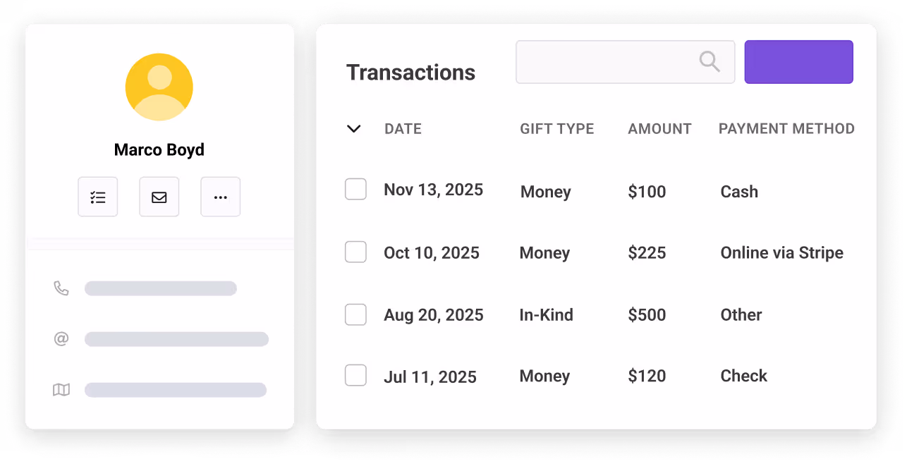 Keep a complete and accurate picture of a supporter's total giving by logging every contribution, from online gifts to in-kind donations and offline checks. This unified record ensures no contribution is overlooked and gives you a true understanding of each donor's history.